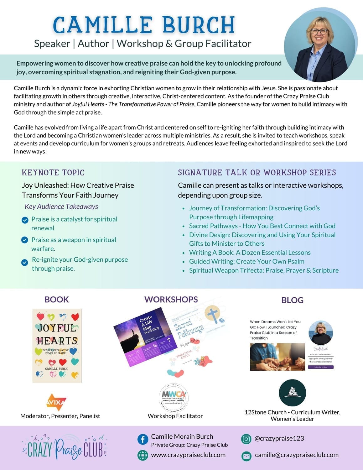 On behalf of the team, welcome to Crazy Praise Club! We love that you’re connecting with like-minded believers who want to experience God in new ways. Whether it’s with our online content and courses, a live event or workshop, or tapping into our tools and resources, rest in knowing that everything we offer is crafted with care to transform believers!
